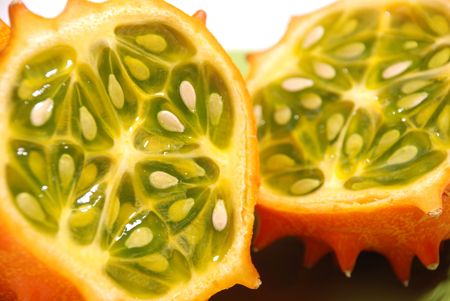 白い背景の上にについて キワノやアフリカの角のあるメロン スライス オープン またとして知られているアフリカの角のキュウリは ひょうたんのヘッジ英語トマト の写真素材 画像素材 Image